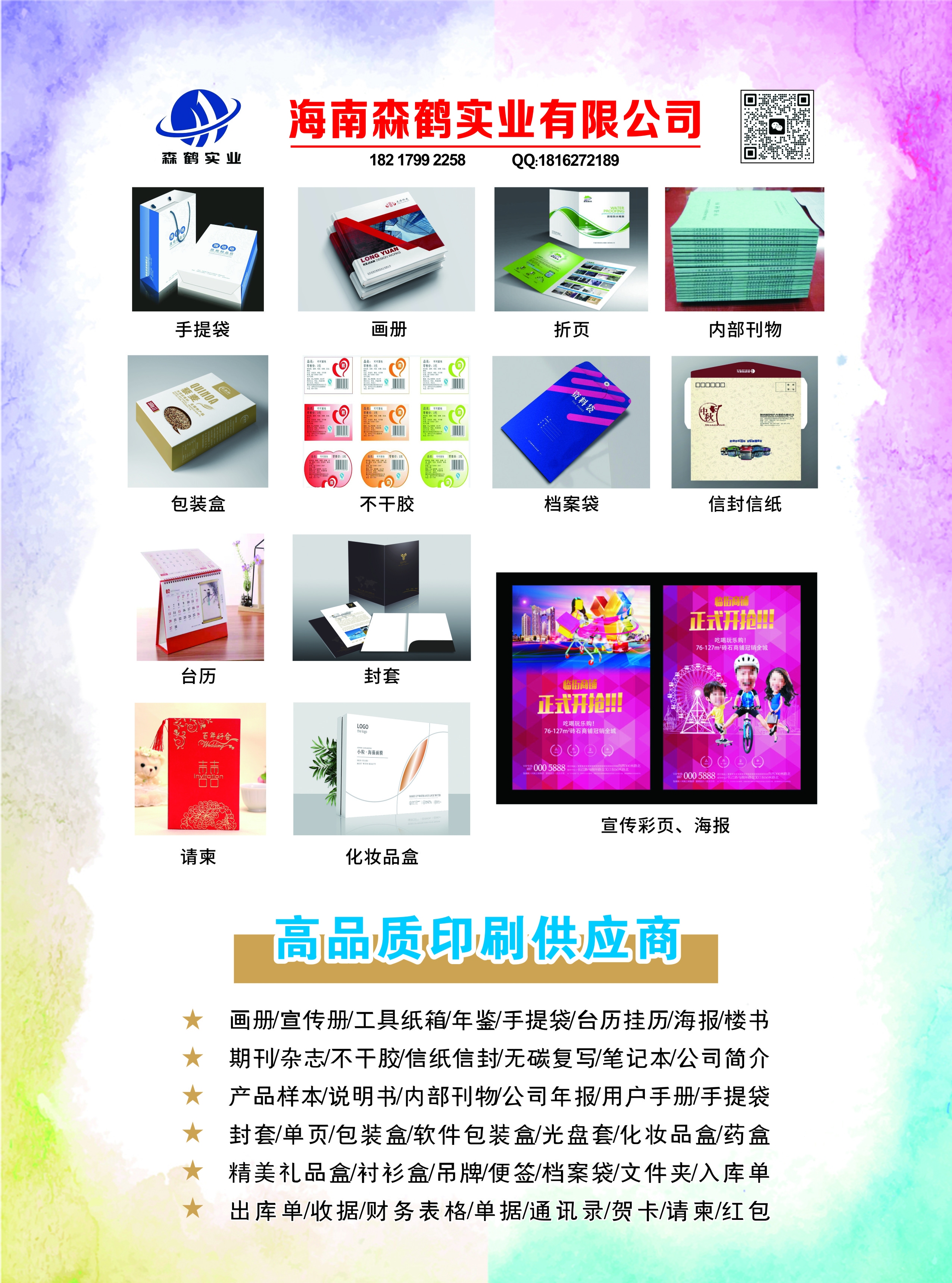 海南森鹤实业有限公司成立于2020年4月,是海南自贸港领先的(信息、通信、广告)一家互联网+实体经济为一体的民营优秀企业。2022年5月被国家科技部评定为国家型科技型企业。公司现有员工30余人,设并一家印刷生产基地,当日可产20万图册供应需求量。