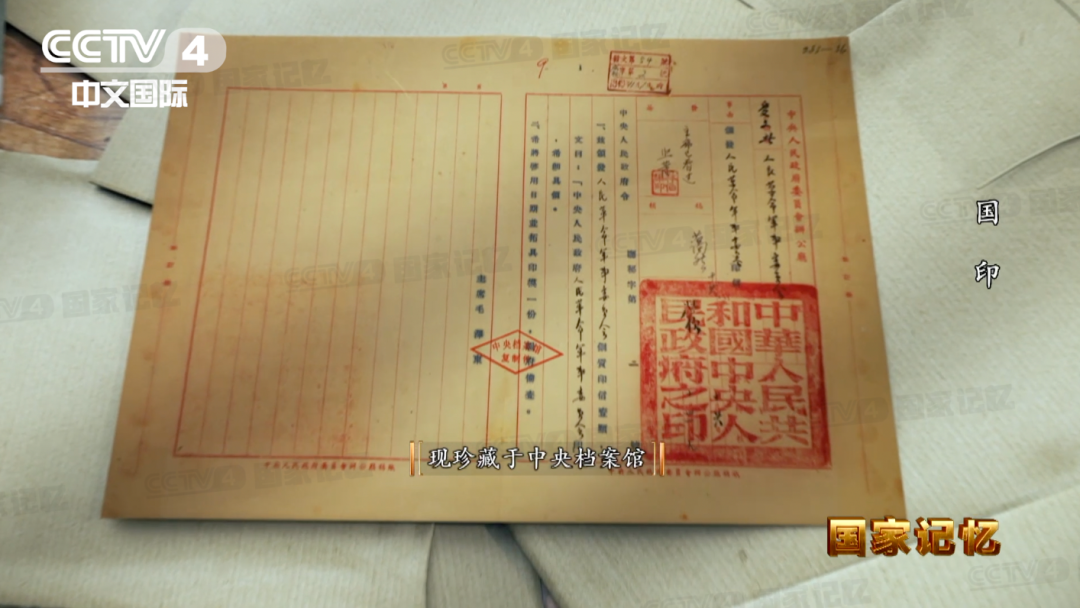 在中央档案馆里珍藏着一份目前所见最早钤有国印的文件——“中央人民政府令:兹颁发人民革命军事委员会铜质印信壹颗”。