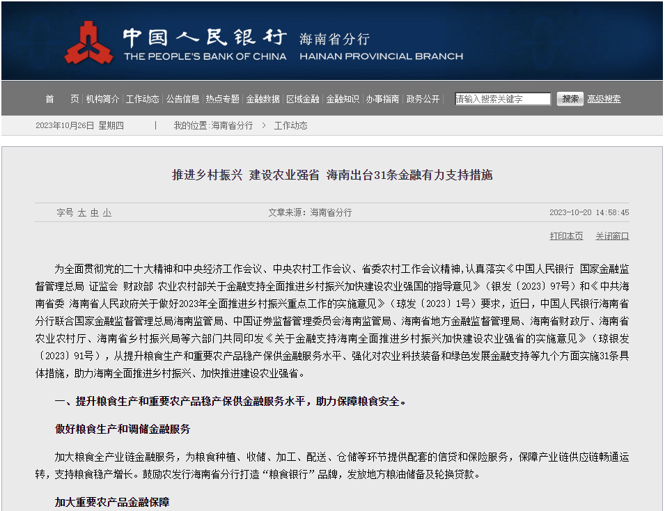 近日,中国人民银行海南省分行联合国家金融监督管理总局海南监管局、中国证券监督管理委员会海南监管局、海南省地方金融监督管理局、海南省财政厅、海南省农业农村厅、海南省乡村振兴局等六部门共同印发《关于金融支持海南全面推进乡村振兴加快建设农业强省的实施意见》(琼银发〔2023〕91号),从提升粮食生产和重要农产品稳产保供金融服务水平、强化对农业科技装备和绿色发展金融支持等九个方面实施31条具体措施,助力海南全面推进乡村振兴、加快推进建设农业强省。